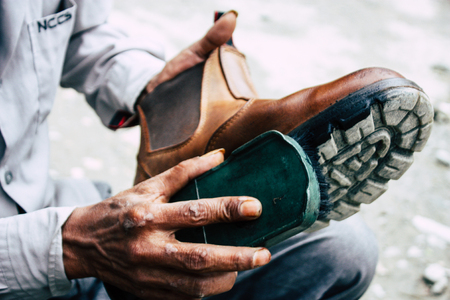 Kathmandu Nepal August 22, 2018 Closeup of a Nepali shoe polisher working at Thamel street in Kathmandu in the morning