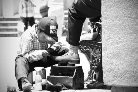 A man cleans shoes for a man sitting in front of him in an armchair in the center of Mexico City