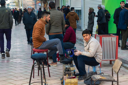Dogubayazit, Turkey - December 10, 2018: Shoe cleaner with a client working on the streets of Dogubayazit, Turkey,