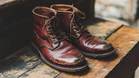 A pair of classic brown leather boots rests on a rustic wooden surface, showcasing their vintage charm and craftsmanship. Ideal for fashion and footwear enthusiasts.