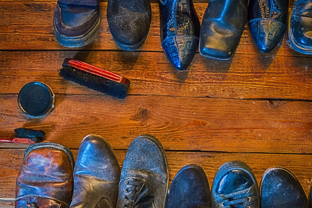 vintage brown shoes, cleaning brush and cream in a metal pot on aged textured wooden surface.