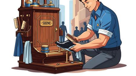 A man kneels and polishes a black shoe at a wooden shoe shine stand with brushes and polish.