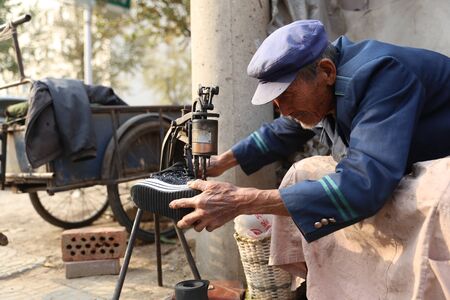 Shoemaker Repairing Shoes In The Street On Blurred Background