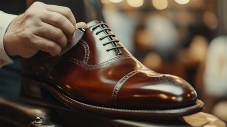 A dedicated shoe seller expertly polishes a formal leather shoe, highlighting the gleaming surface and intricate details. The movement of the cloth showcases craftsmanship.