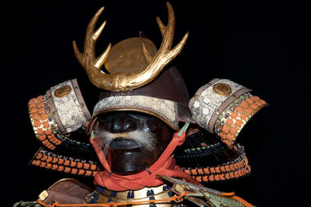 Detailed portrait of a samurai in authentic, ornate armor with a stern expression, symbolizing discipline and tradition