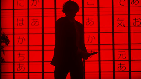 Person against big digital wall in studio. Silhouettes of man acting with japanese sword katana in front of digital screen red asian graphic background.