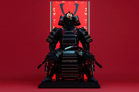 A samurai warrior is sitting in a chair in front of a red background. The warrior is wearing a black suit and holding a sword. Concept of power and strength