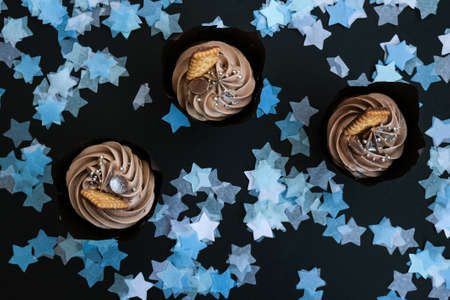 Delicious chocolate cupcakes with cream on dark background. Three chocolate muffin. Birthday cake party. Boy or girl baby party cake Homemade Chocolate Cupcake