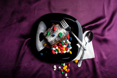 Matcha green tea macadamia cake on a white table. Free space for text . Top view