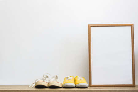 Sneakers on wooden floor, with copy space. Top view and Vintage effect.