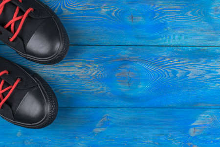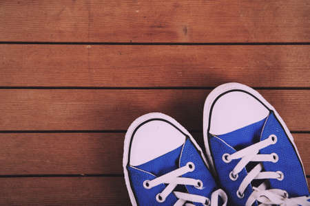 Overhead view of shoes on blue wooden floor. Shoes on a wooden background. Sneakers on a wooden floor. Sport, fitness, shoes, footwear and objects concept