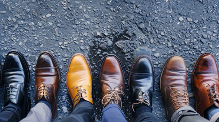 A group of people wearing business shoes standing on a cobblestone walkway, sharing conversation and enjoying the outdoor ambiance.