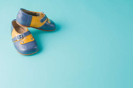 Baby boy shoes, shower invitation concept, on blue wooden background, banner, copy space, top view