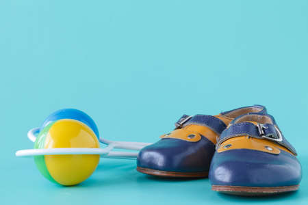 Baby birthday invitation. Vintage leather booties on aquamarine background
