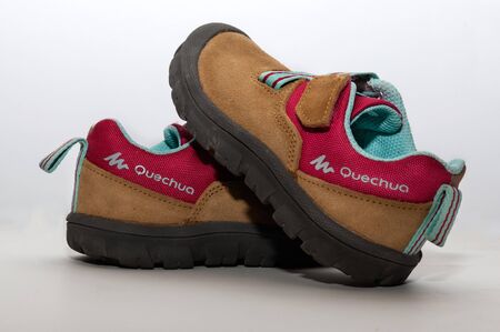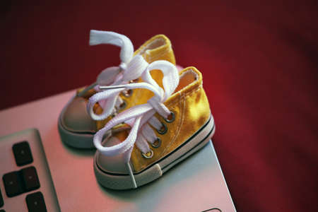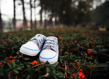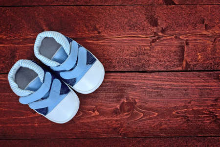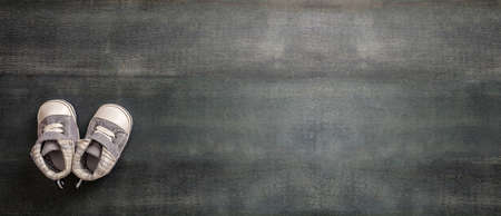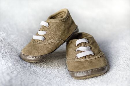 Old baby sneakers closeup photo.
