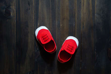 Children's cute red small sized canvas shoes top view overhead shot on black wood texture background with copy space. Red children casual shoes.