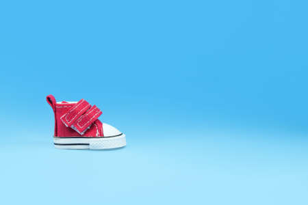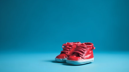 Pair of red baby shoes on blue background with copy space.