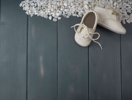 White newborn shoes, with tied laces, on a bed of white stones and gray wood