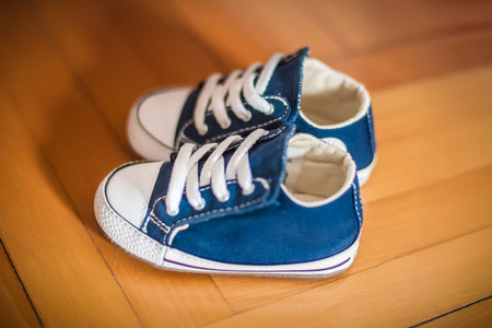 A pair of adorable blue baby sneakers is resting on a polished wooden floor. The shoes feature white laces and classic detailing, ideal for young explorers.