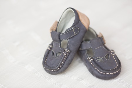 Little newborn baby shoes with copy space. Tiny boots close up. Baby concept