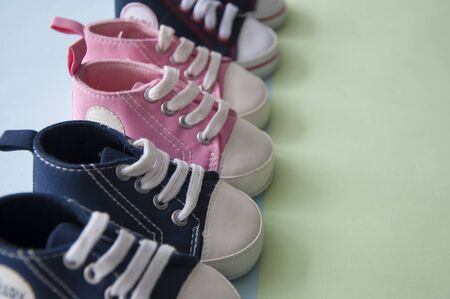colorful canvas shoes or sneakers for kids or baby foot on paper background view with copy space.