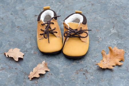 Baby boots in forest. Kid shoes with autumn leaves outdoors.