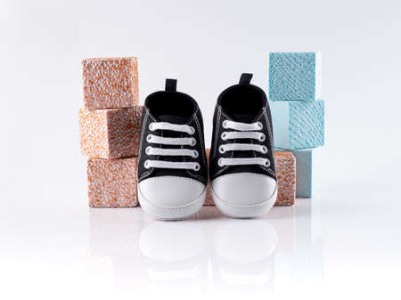 lovely baby shoes on white background with decoration boxes, prepare for baby concept.