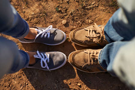 Closeup of man and woman legs in outdoor shoes together. Couple dating sitting together. Love and romance. Romantic dating. Details and body parts. Web banner header.