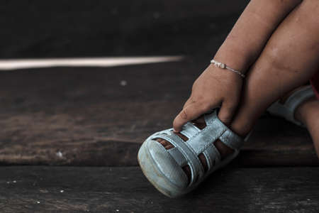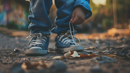 Little boy tying shoelaces on the ground. Close up shot.