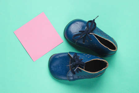 Children's leather shoes on a blue background with pink memo paper for copy space. Top view