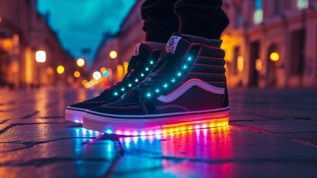 An AI generated illustration of a closeup of glowing sneakers on the dark street