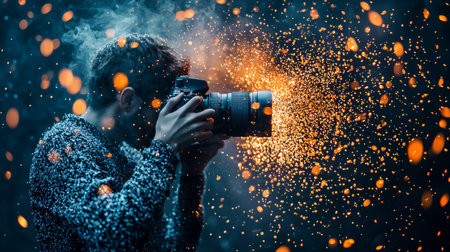 A photographer holding a camera surrounded by sparks and smoke, creating a dramatic and dynamic atmosphere with vibrant energy and focus.