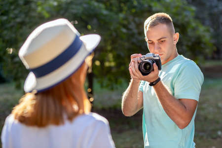 A man takes a photo on a vintage film camera in nature.