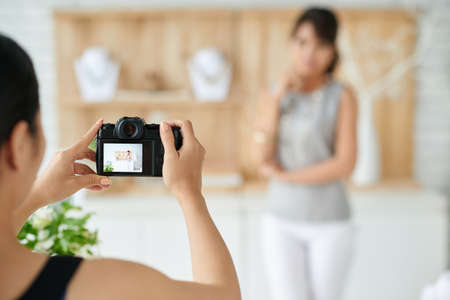 Pretty young female photographer checking photos