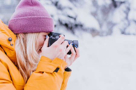Cheerful girl photographer in a yellow jacket takes pictures of winter in a snowy park
