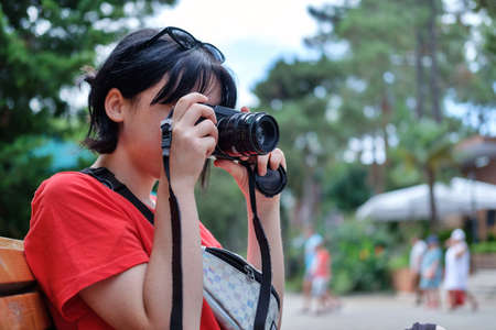 Beautiful asian thai woman traveler taking photo with vintage camera outdoors.