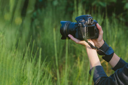 Close-up, professional photo-video camera in the hands of a girl. Against the background of green nature and forest