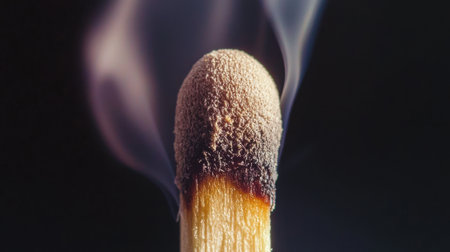 A detailed shot of a burning matchstick, with smoke spiraling upward as the flame flickers, highlighting the fleeting nature of fire.