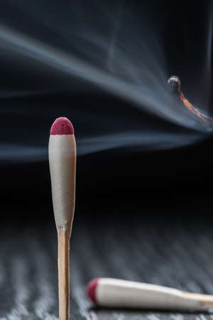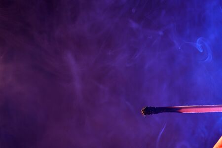 Burning match isolated on black background with smoke clouds. Macro photo.