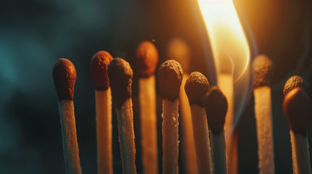 Brightly burning matchstick casts a warm glow on a dark, textured surface. an open matchbox filled with unlit matches sits nearby, symbolizing new beginnings, light, and potential.