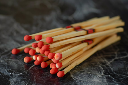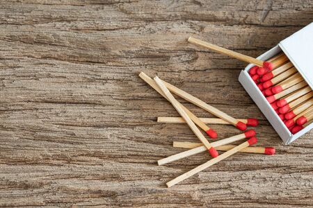 Wooden matches for ignition that have fallen out of the box are lying on the table