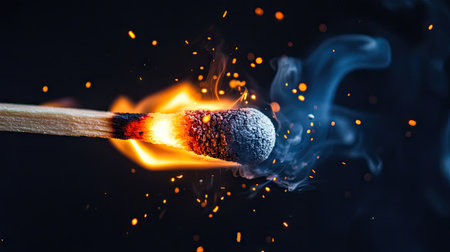 Close-up of burning match head with sparks and smoke against black backdrop, symbolizing fragility, danger, and energy