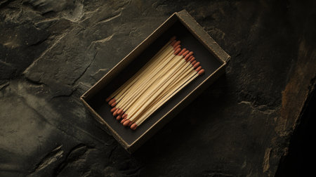 A neatly arranged collection of wooden matches with red tips in a box, set against a dark stone background, perfect for themes of warmth, fire, and minimalism.