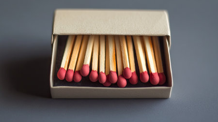 This image features a neatly arranged box of unused matchsticks with striking red tips, set against a smooth gray background, ideal for artistic and creative projects.