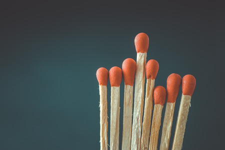 A bunch of matches with a lit match on top. Concept of danger and caution, as the lit match is surrounded by other matches that could easily catch fire