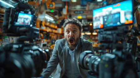 A surprised man with an open mouth standing in a broadcast studio surrounded by professional cameras, conveying shock and unexpected news.
