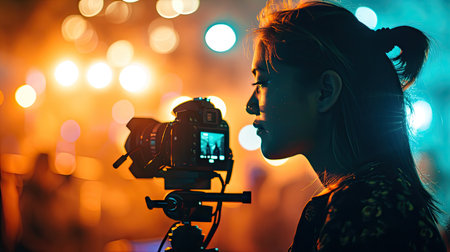 Cinematic portrait of a videographer filming in low light with a professional camera, intense focus on the scene, surrounded by colorful bokeh lights in the background.