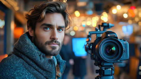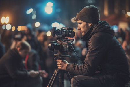 A focused young cinematographer handles a professional film camera on a bustling city street, capturing the essence of urban life.