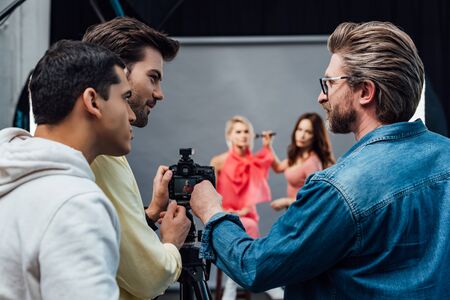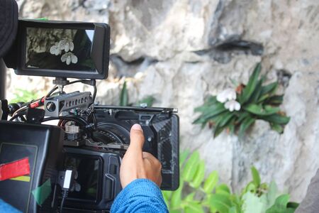 Recording video at studio. Camera records or filming for professional bloggers. Behind the scenes of filming video production. film crew on the set in film studio. Backstage video production recording