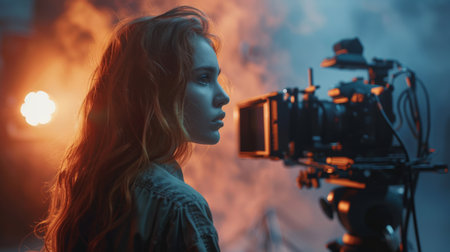 Professional film crew working in a studio, using advanced camera equipment and lighting to capture high-quality footage in a cinematic environment.
